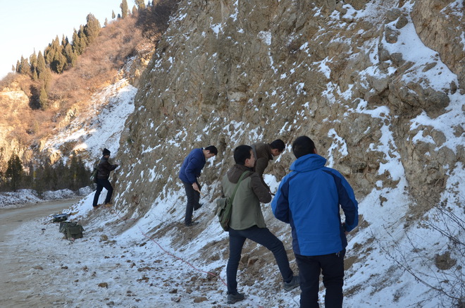驪山梁上積雪未消,隊員們冒著零下3℃的低溫認真的測量地質剖面。他們分工明確,有人拉皮尺,有人定巖性,有人管記錄。寒風吹過參賽隊員的臉頰,他們毫無知覺,一心一意專注于比賽之中。擂臺之上比速度,實戰之中看技能,這樣的比賽場面,也展示著地質隊員精益求精的工作態度。